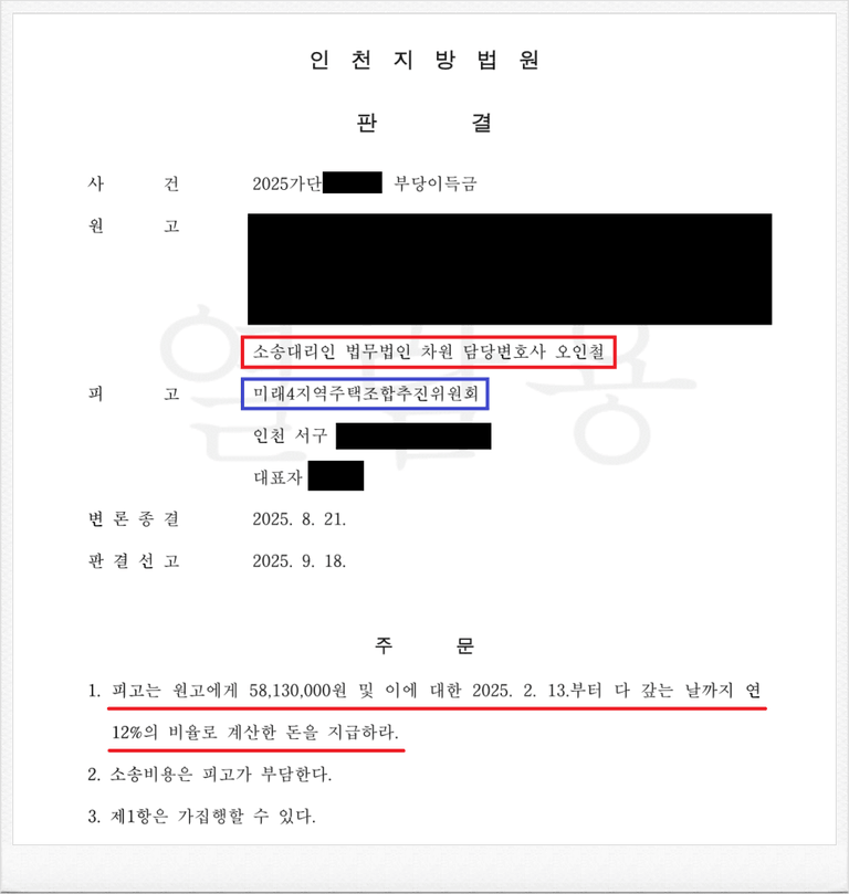 제게 지역주택조합 관련 납입금 반환 소송을 의뢰해 주실 경우, 별도의 추가 비용 없이 강제집행 절차까지 함께하며, 실제 환불이 이루어질 때까지 성공보수를 청구하지 않는 원칙을 고수하고 있습니다.
