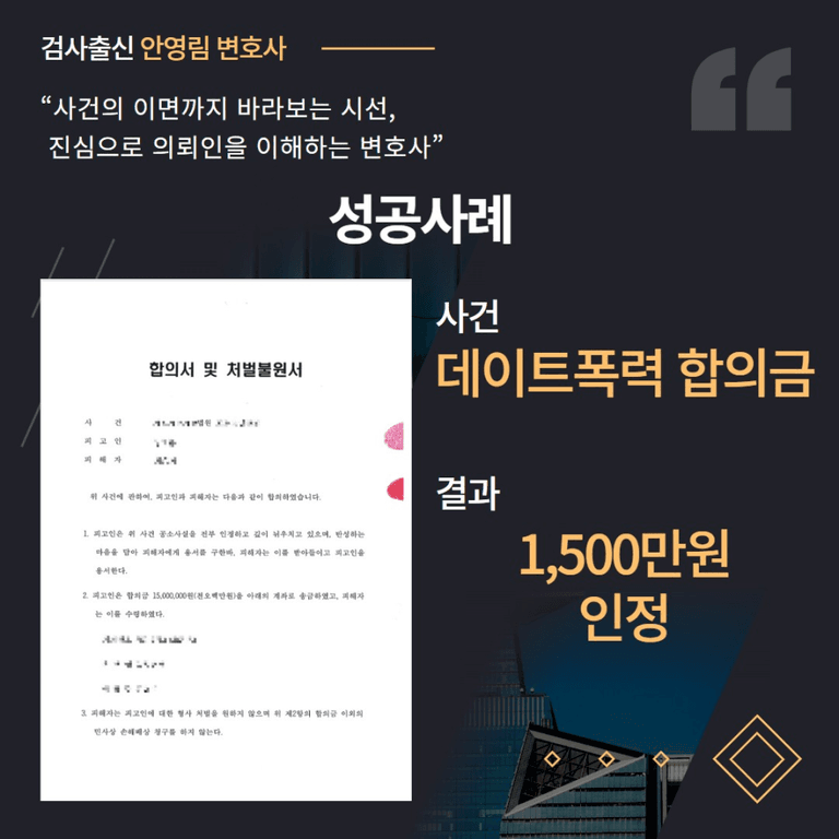데이트폭력 고소대리 → 결과 : 합의금 ‘1,500만원’ 인정