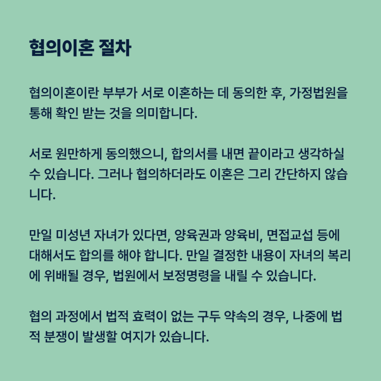 한편 어떤 분들은 서로 원만하게 동의를 했으니 합의서를 내면 끝이라 생각을 하시는데요. 그리 간단한 과정은 아닙니다.