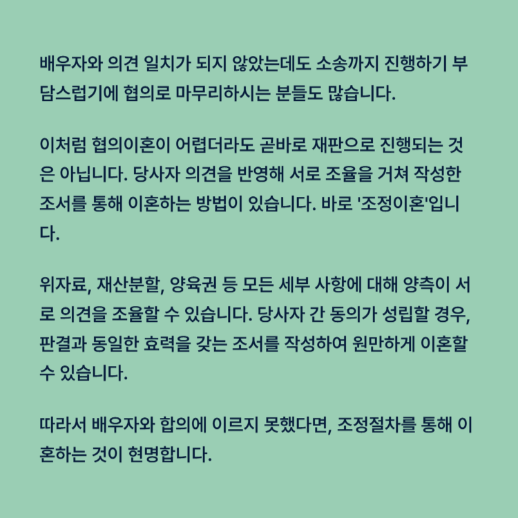 따라서 재산분할, 위자료 혹은 그 외 다른 원인으로 문제가 발생하였다면, 곧바로 협의에 임하기보다는 법률 조력을 구하여 조정절차를 밟는 것이 현명합니다.