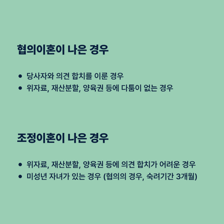 특히 미성년 자녀가 있다면 3개월의 숙려기간을 반드시 거쳐야 하므로, 재산·양육 문제에서 분쟁이 생기면 결과적으로 조정보다 더 긴 시간이 걸릴 수도 있습니다.