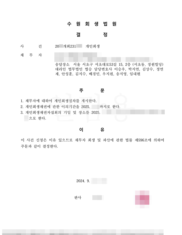 이혼숙려 기간이었기 때문에 추후 자녀 양육비 및 재산분할 문제로 변제금 등의 변동이 있을 것으로 예상하여 빠르게 진행하였습니다. 최저시급 이하의 소득임에도 불구하고 보정없이 개시결정을 받을 수 있도록 도와드렸습니다.