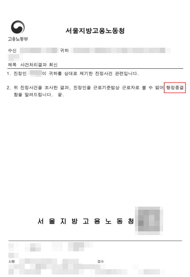 결국 노동청은 A가 근로자가 아니어서 B와 C에게는 아무런 혐의가 없다는 이유로 ‘행정종결’ 처리를 했습니다.