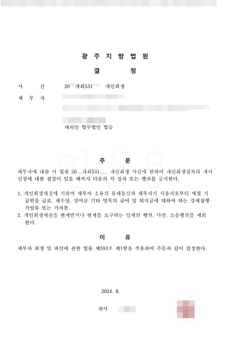광주지방법원은 금지명령의 기각률이 상대적으로 높은 편입니다. 하지만 대출 사기로 인해 개인회생에 이르게 된 점을 자필 탄원서로 작성하도록 도와드렸고, 이를 통해 금지명령 결정을 받을 수 있었습니다.