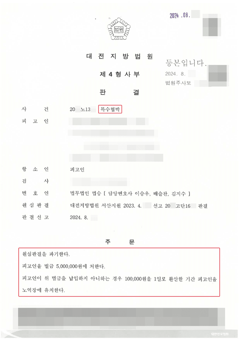 이번 사건은 장애인인 의뢰인이 특수협박 혐의로 기소되어 1심에서 실형을 선고받았으나, 대리인의 치밀한 변론으로 항소심에서 벌금형을 선고받은 의미 있는 사례입니다. 대리인은 의뢰인의 장애와 우발적 범행 동기, 반성하는 태도 등을 입증하여 의뢰인이 직장을 잃지 않고 정상적인 사회생활을 이어갈 수 있도록 조력하였습니다.