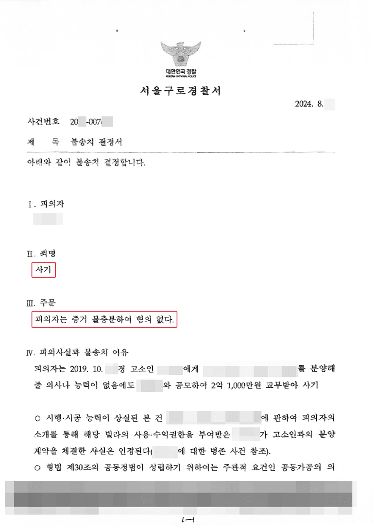 이번 사건은 의뢰인이 부동산 사기 혐의로 고소당했으나, 변호인의 치밀한 증거 분석과 논리적인 변론으로 혐의없음 처분을 받은 의미 있는 사례입니다.