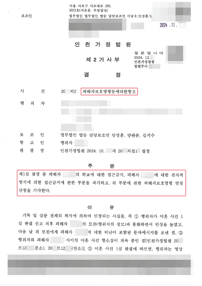 항고심 법원은 의뢰인의 항고를 일부 인용하여 자녀에 대한 접근금지 부분을 취소하였습니다.