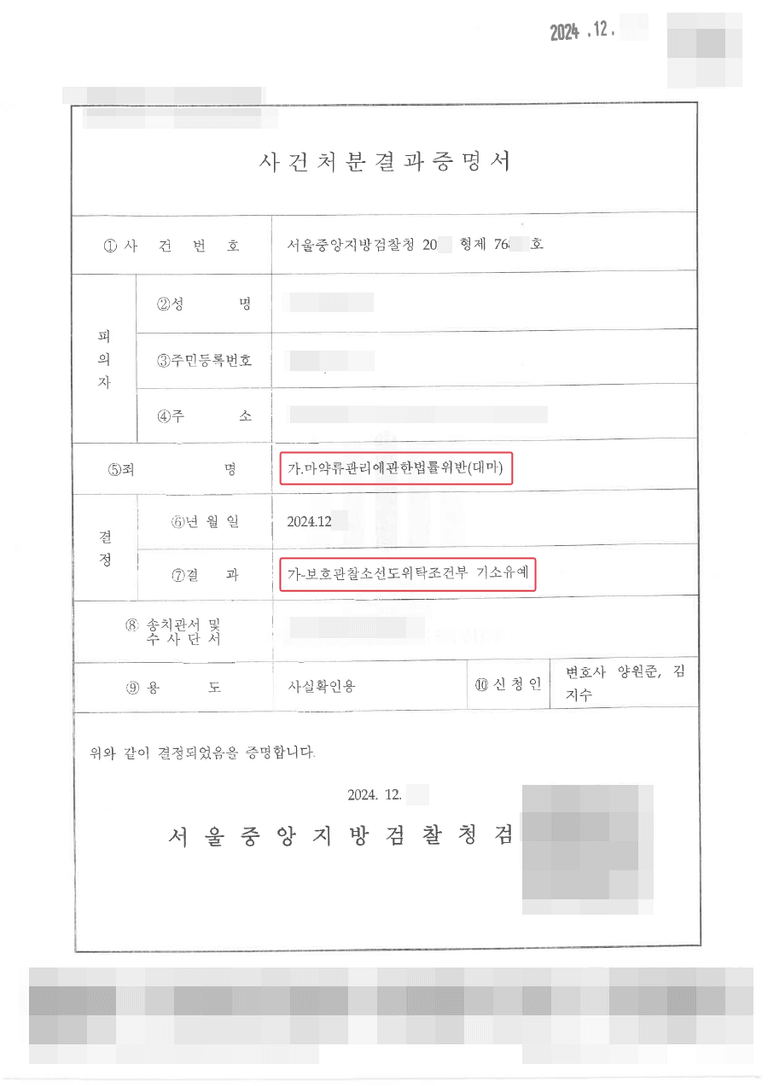 수사기관은 의뢰인이 초범이고 호기심에 의한 범행이었다는 점, 취급한 마약류의 수량이 비교적 크지 않은 점, 자신의 잘못을 인정하고 진심으로 반성하는 점 등을 고려하여 보호관찰소선도위탁조건부 기소유예 처분을 내렸습니다.