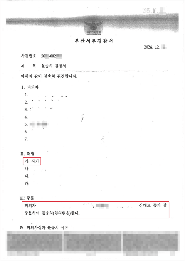 수사기관은 변호인의 주장을 받아들여, 의뢰인이 전세대출 사기 조직의 범행을 인식하거나 가담했다고 볼만한 증거가 부족하다고 판단하였습니다. 특히 의뢰인이 임대차 계약서 작성에 직접 관여하지 않은 점, 사기 조직의 다른 구성원들과 접촉이 없었던 점, 범행에 대한 인식이 없었던 점 등을 고려하여 혐의없음 결정을 내렸습니다.