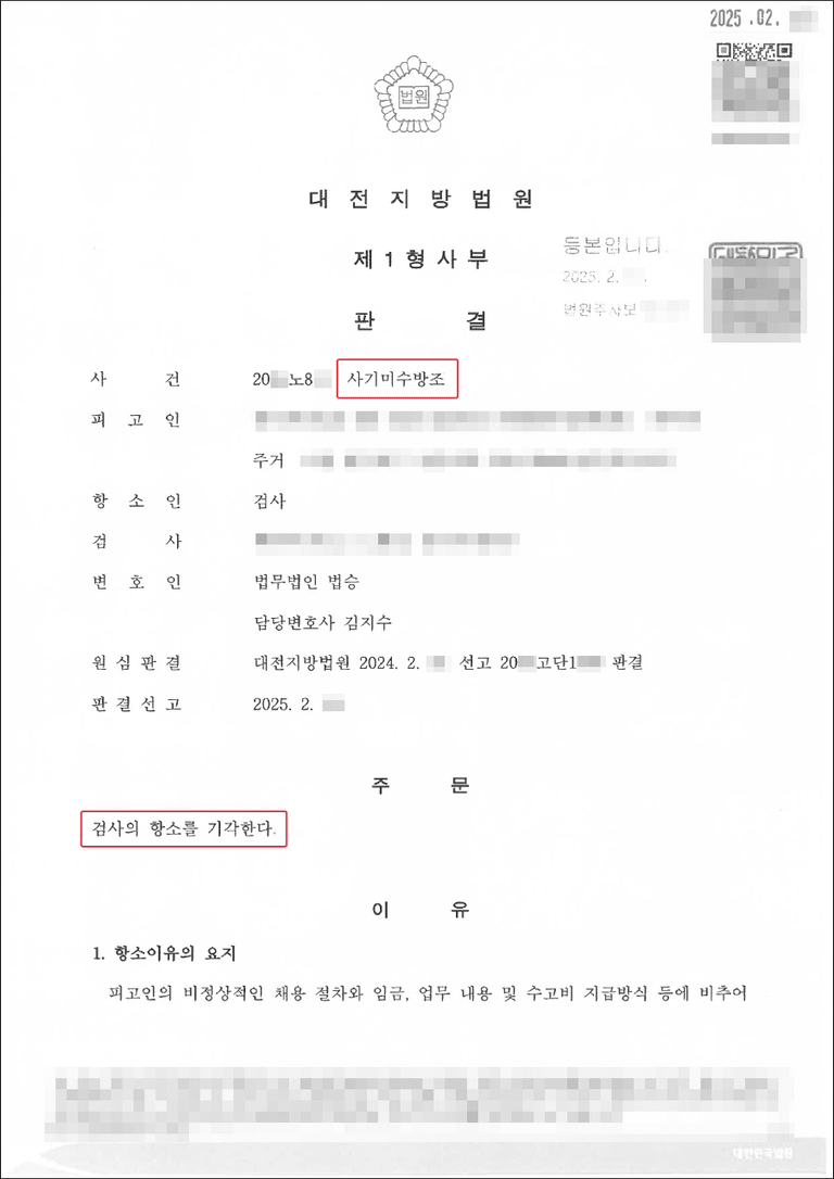 7. 보이스피싱 연루 사실의 사후인지(事後認知) 증명: 변호인은 의뢰인이 체포 이후에야 이 일이 보이스피싱과 연관되어 있다는 사실을 알게 되었음을 입증하는 통화 녹음을 제출하였습니다. 녹음에서 업무 지시자는 의뢰인이 사기당한 것이 맞으며 피해자임을 인정하는 발언을 하였습니다.