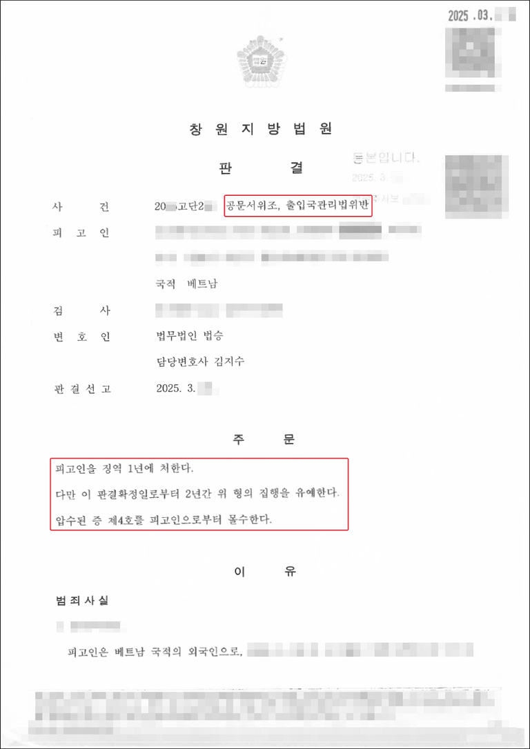 본 사건은 베트남 국적의 외국인인 A씨가 공문서위조 및 출입국관리법위반으로 기소된 사건입니다. 의뢰인은 구직활동 체류자격(D-10)으로 대한민국에 입국한 후 체류기간이 만료되었음에도 불구하고, 출국하지 않고 약 4년간 불법체류하였습니다. 또한 SNS를 통해 알게 된 위조업자에게 일정 금액을 지급하고 외국인등록증을 위조 의뢰하여 수령한 혐의를 받았습니다.