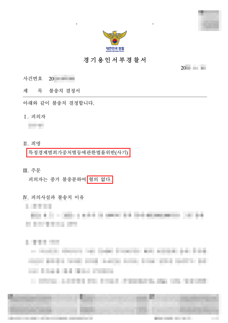 경찰은 피의자에 대해 증거불충분으로 불송치(혐의없음) 결정을 내렸습니다. 경찰은 투자금의 성격상 손실이 예정되어 있고, 원금보장 약정에 대한 명확한 증거가 없으며, 피의자가 이미 상당 금액을 지급했고, 처음부터 고소인을 기망하여 금원을 편취했다고 보기 어렵다고 판단했습니다.
