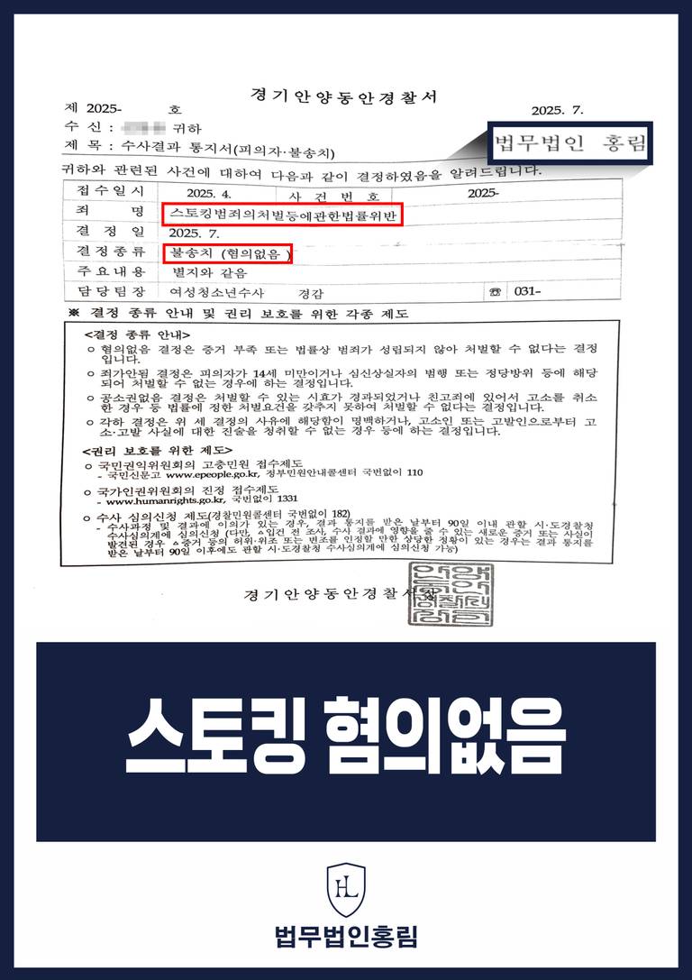 변호인의 체계적이고 설득력 있는 변론 덕분에, 경찰은 A씨의 행위에 스토킹의 고의가 없었으며, 피해자에게 불안감이나 공포심을 유발할 정도의 지속성이 있었다고 보기 어렵다고 판단했습니다. 결국, A씨에게는 '혐의없음' 불송치 결정이 내려졌습니다. 이로써 A씨는 억울한 스토킹 혐의에서 벗어날 수 있었고, 일상을 되찾을 수 있었습니다.