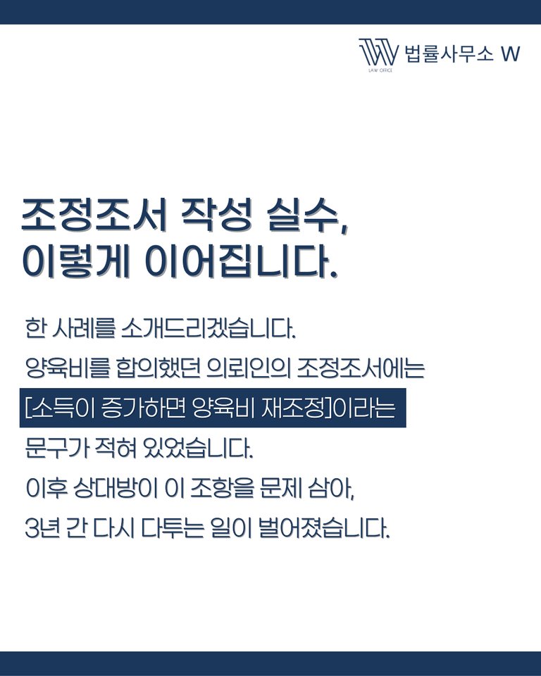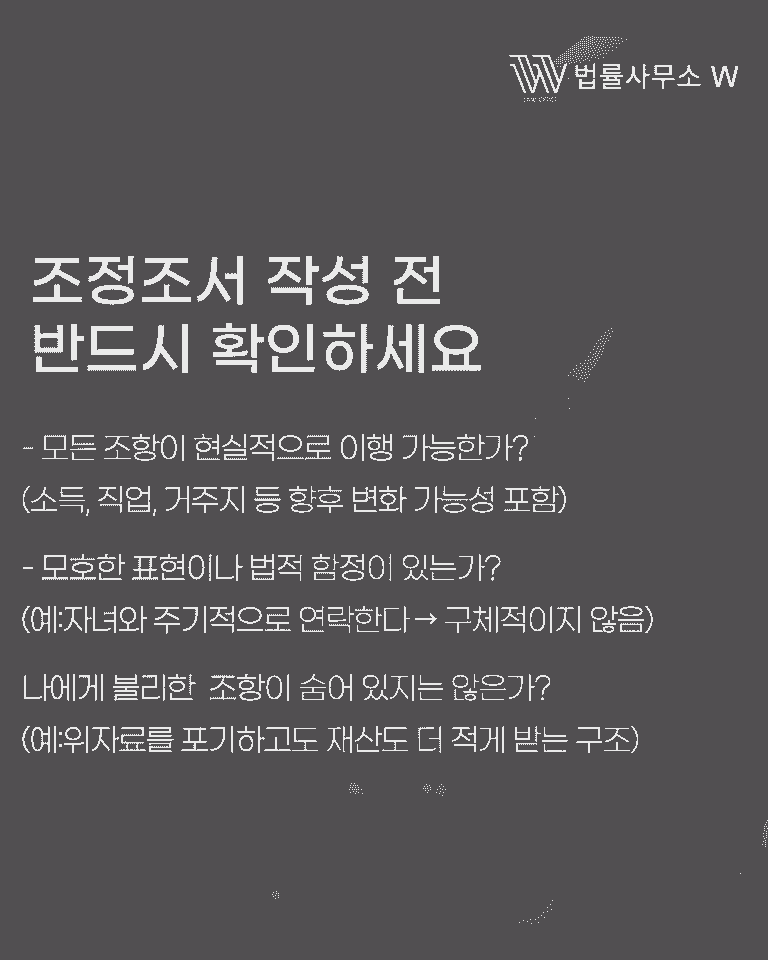 잘못 작성된 조정조서 한 장이, 정작 재산과 양육에 있어서는 ‘함정’이 될 수도 있습니다. 조정이혼을 준비하고 계신다면, 단순한 조서 작성을 넘어서 법적 전략을 함께 고민할 변호사를 찾으셔야 합니다.