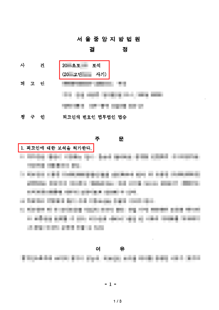 법원은 법무법인 법승의 주장을 받아들여 보석을 허가하였습니다. 보증금은 보석보증보험증권으로 갈음할 수 있도록 하였고, 서약서 제출 및 출석 의무 등의 조건을 부과하였습니다.