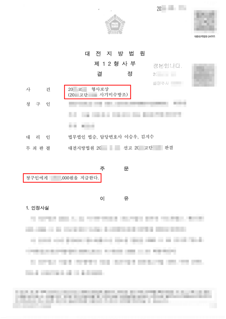 법무법인 법승은 무죄 확정 후 의뢰인의 경제적 손실을 회복하기 위해 형사보상청구를 진행하였습니다. 형사보상청구는 단순히 지출한 비용을 그대로 인정받는 것이 아니라, 법령에서 정한 기준과 범위 내에서 보상이 이루어지므로 전략적인 접근이 필요했습니다.