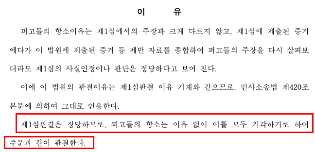 변론기일에서도 원심을 변경할 만한 상대방의 결정인 주장과 변론이 없었고 항소심 재판부도 원심의 판단을 존중하는 듯한 느낌이 들었습니다. 항소심 결과는 예상대로 원심 판단이 정당하므로 상대방 피고들의 항소를 기각하였습니다.