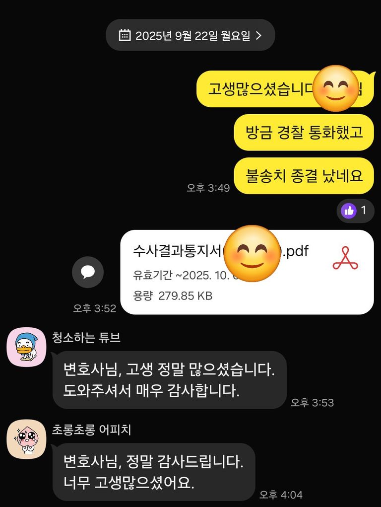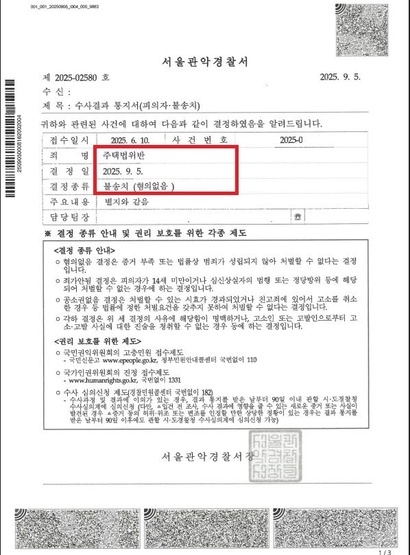 아래와 같이 '불송치'로 종결되셨습니다.