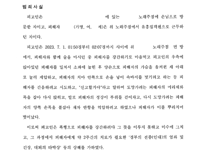 A씨는 2023. 7. 1. 01:50경 회식을 마치고 혼자 노래주점에 방문하여 유흥접객원 B씨와 술을 마시던 중 B씨와 강제로 성관계를 하려다가 상해를 입혔습니다.