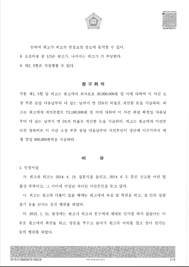 본 사건은 배우자의 가정폭력으로 인해 이혼 및 위자료 판결이 내려졌고, 비교적 짧은 4년여의 혼인기간임에도 의뢰인의 재산비율을 30%로 산정하였습니다. 아울러 자녀들의 친권자 및 양육자로 지정받아 추후 배우자로부터 매월 90만원씩 양육비를 지급받을 수가 있습니다.
