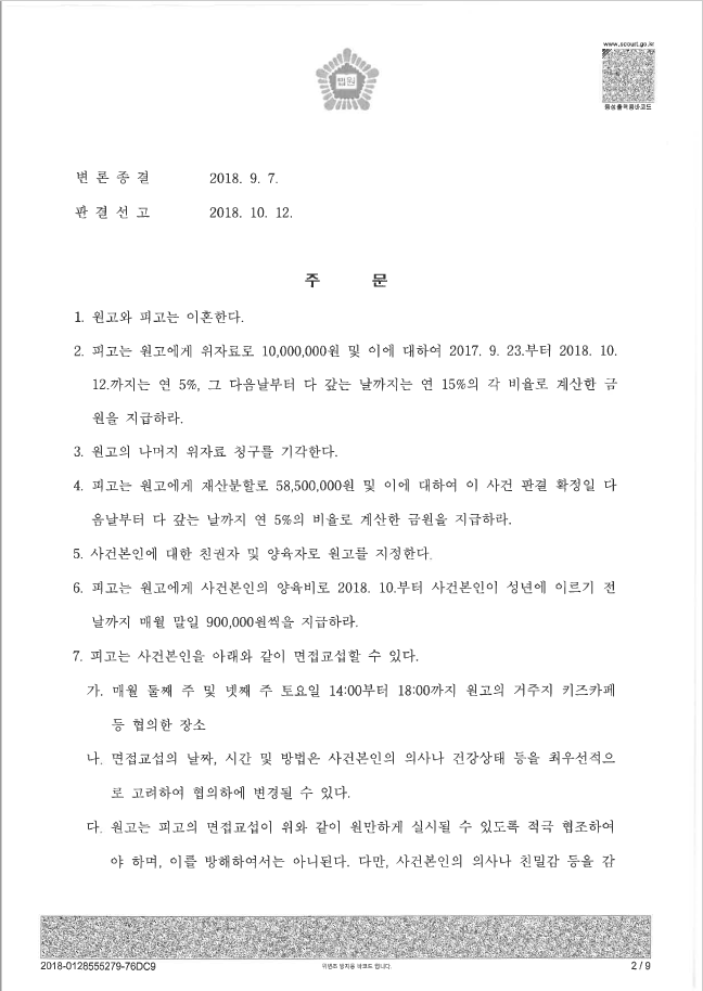 이혼 및 위자료 1,000만원, 재산분할금 5억 8,500만원, 친권자 및 양육자 단독 지정, 장래양육비 매월 90만원