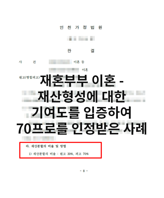 재혼부부 이혼 - 재산형성에 대한 기여도를 입증하여 70프로를 인정받은 사례