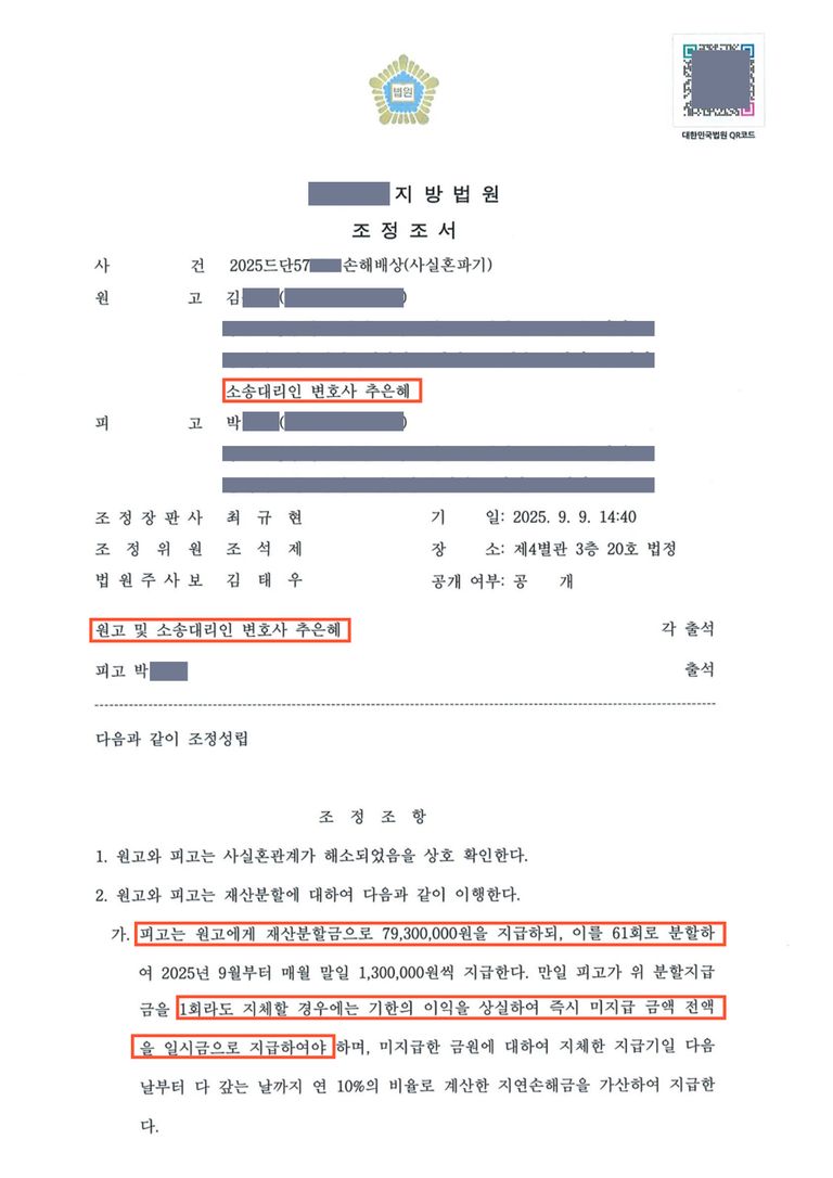 조정 단계의 전략적 활용: 특히 가사 사건은 소송으로 갈 경우 장기간의 공방과 감정 소모가 발생할 수 있습니다. 저희는 의뢰인의 상황을 고려하여 법원의 조정 절차를 통해 양 당사자가 모두 수용할 수 있는 현실적인 합의점을 이끌어내고자 했습니다. 특히 상대방이 분할금을 제때 지급하지 않을 경우에 대비한 법적 장치를 마련을 놓치지 않았습니다.