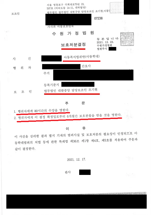 재판부는 조기현 변호사의 주장을 받아들여 사건의 성격상 가장 경미한 처분인 80시간의 아동학대방지 수강명령과 6개월의 보호관찰이라는 아동보호처분을 부과하는 것으로 사건을 종결하였습니다.