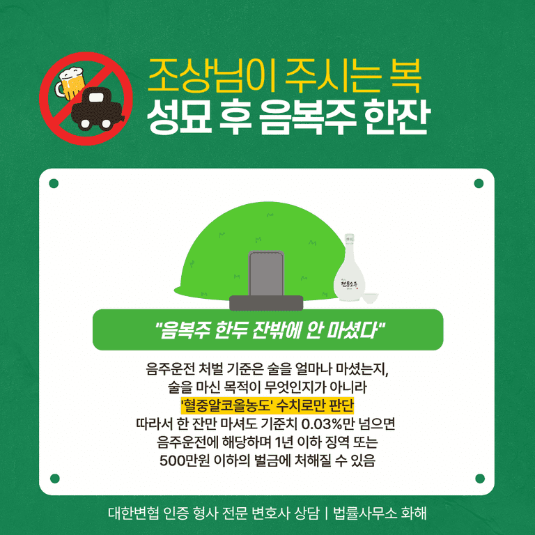 실제로 명절만 되면 "음복주 한두 잔밖에 안 마셨다"라며 억울함을 토로하는 사례가 뉴스나 상담 현장에서 자주 나오곤 하는데요. 그러나 음주운전 처벌 기준은 술을 얼마나 마셨는지, 술을 마신 목적이 무엇인지가 아니라 오직 '혈중알코올농도' 수치로만 판단하죠. 따라서 한 잔만 마셔도 기준치인 0.03%만 넘으면 곧바로 음주운전에 해당하며 1년 이하 징역 또는 500만원 이하 벌금의 형사처벌을 받을 수 있습니다.
