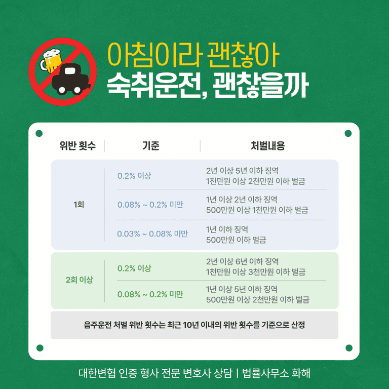 하지만 숙취운전이라고 해서 처벌이 달라지지 않습니다. 혈중알코올농도가 기준치인 0.03% 이상이면 일반 음주운전과 동일하게 다뤄지며, "술이 깬 줄 알았다"거나 "전날 마셨다"는 변명은 법적 효력이 없습니다.