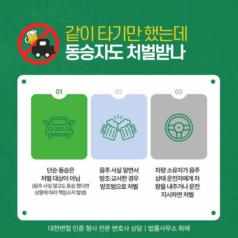 음주운전 관련 상담 중 가장 많이 받는 질문 중 하나가 바로, 음주운전 차량에 동승했을 때 동승자도 함께 처벌받는지 여부입니다. 결론부터 말씀드리면, 단순히 음주운전 차량에 함께 탑승한 것만으로는 처벌받지 않습니다. 하지만 몇 가지 예외가 있으므로 주의가 필요합니다.