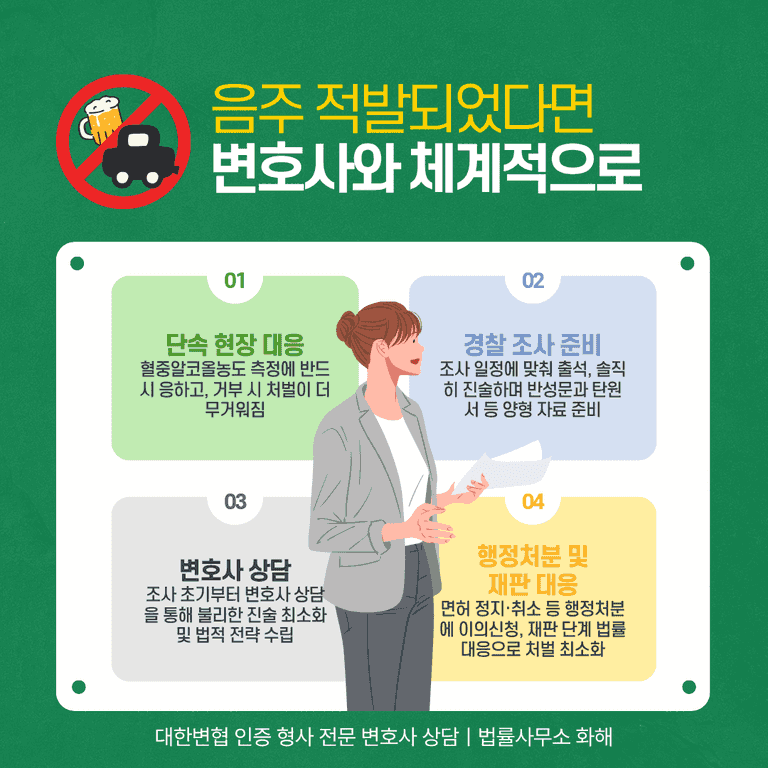 음주운전은 절대 해서는 안 되는 행위이지만, 만일 적발되었다면 당황하거나 절차를 거부하지 말고 차분하게 체계적으로 대응하는 것이 무엇보다 중요합니다.