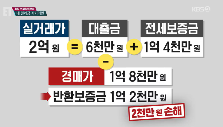 A: 하나 사례를 준비해 왔는데요. 어떤 주택의 매매 실거래가가 2억 원 정도라고 한다면 이때 집주인이 은행으로부터 6,000만 원 정도를 대출을 받았을 것입니다. 그런 상황에서 세입자가 1억 4,000만 원짜리 전세로 들어간다, 이런 경우에는 문제가 생길 수 있습니다. 왜 그러냐면, 경매로 진행이 되면 2억 원짜리 주택이 1억 8,000만 원 정도에 낙찰이 될 수가 있고요. 은행이 6,000만 원을 먼저 가져가게 됩니다. 그럼 세입자는 1억 4,000만 원 전세금 중에서 2,000만 원을 빼고 1억 2,000만 원만 돌려받을 수 있게 돼서 문제가 생길 수 있습니다.