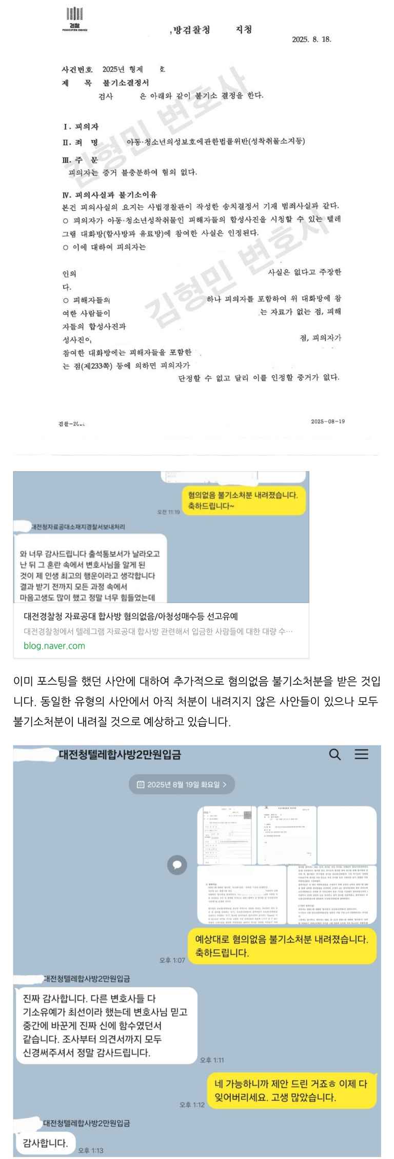 대전경찰청에서 대량으로 소환 조사했던 텔레그램에서 입금한 합사방, 상위방 사안에서 혐의없음 불기소처분이 내려졌습니다.