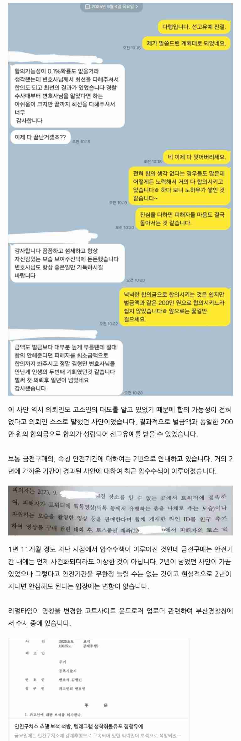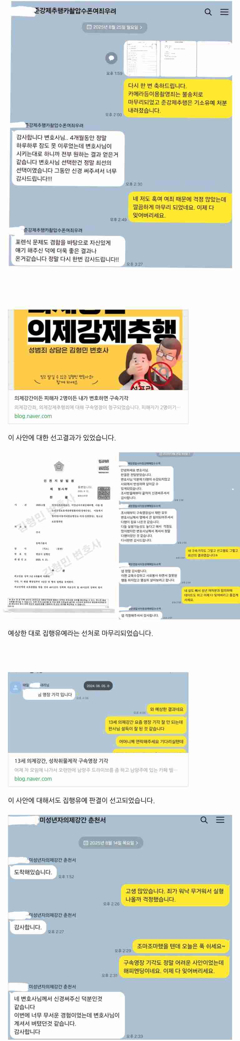 올릴 것들이 많아서 이번 포스팅은 결과 위주로 간략하게 올렸습니다. 이렇게 응원해주는 분들이 있어 하루하루 힘내서 일하고 있는 것 같습니다. 디지털성범죄로 문제된다면 디지털성범죄전문 김형민 변호사의 상담을 받아보기를 바랍니다.