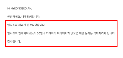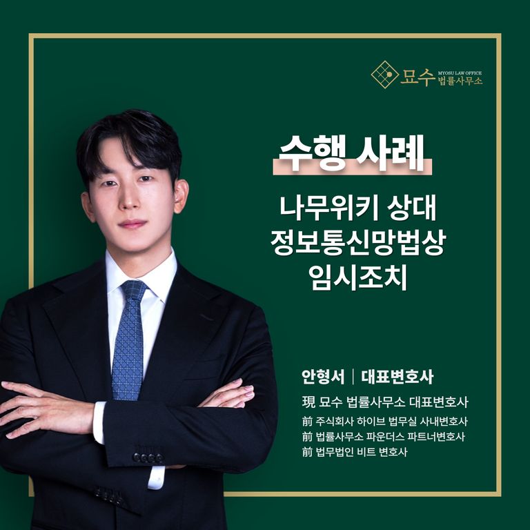 안형서 변호사가 법률 자문하고 있는 유명 유튜버 A씨 또한 나무위키 문서에 기재된 루머로 심각한 피해를 입어 안형서 변호사에게 조력을 요청하였습니다. 이에 안형서 변호사는 그동안 축적된 경험을 바탕으로 나무위키 본사에 정보통신망 이용촉진 및 정보보호 등에 관한 법률상 임시조치를 신청하였습니다. 그 결과 심각한 사이버 명예훼손이 발생하던 문제된 나무위키 문서가 임시조치를 거쳐 최종적으로 완전 삭제 될 수 있었습니다.