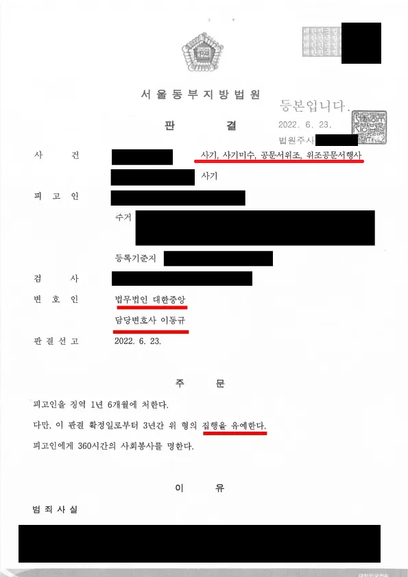 재판부는 이동규 변호사의 주장을 받아들여 의뢰인에게 집행유예형을 선고하였습니다.