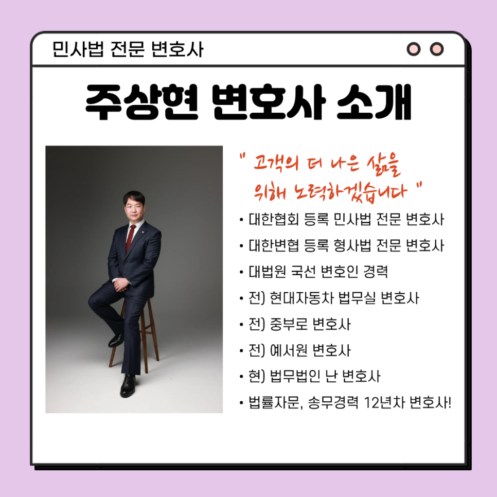 주상현 변호사는 민사법 전문 변호사입니다. 민사소송 상담 및 수임과 관련하여 궁금하신 점이 있으시면 언제라도 연락 주시기 바랍니다(010-3341-8851).