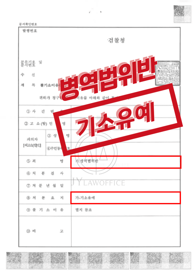 이러한 본 변호인의 조력에 따라, 의뢰인은 병역법위반의 혐의를 받았지만 기소유예 처분을 받고 무사히 사건을 종결시킬 수 있었습니다.
