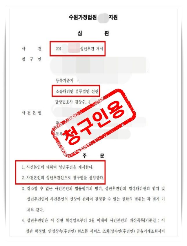 이 사건은 성년후견을 통해 가족의 재산과 권익을 지켜낸 대표 사례입니다.