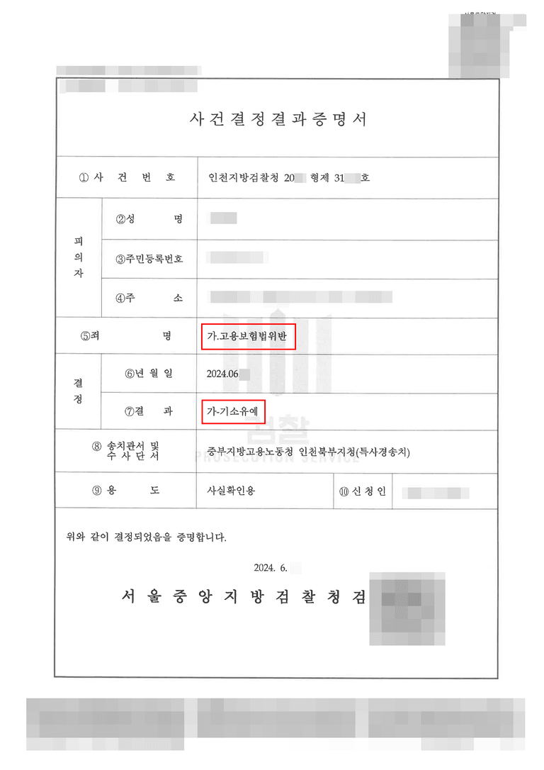 그 결과 담당 검사는 피의사실이 인정되고 피의자가 초범은 아니라고 판단하면서도, 부정수급된 금원이 반환된 점, 피의자가 범행에 대해 모두 인정하고 있는 점 등을 고려하여 기소유예 처분을 하였습니다.