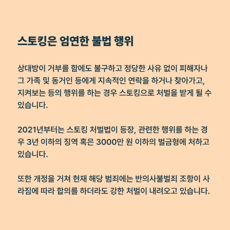 이런 상황이 지속적으로 발생하자 2021년부터는 스토킹 처벌법이 등장, 관련한 행위를 하는 경우 3년 이하의 징역 혹은 3000만 원 이하의 벌금형에 처하고 있습니다. 또한 개정을 거쳐 현재 해당 범죄에는 반의사불벌죄 조항이 사라짐에 따라 합의를 하더라도 강한 처벌이 내려오고 있습니다.