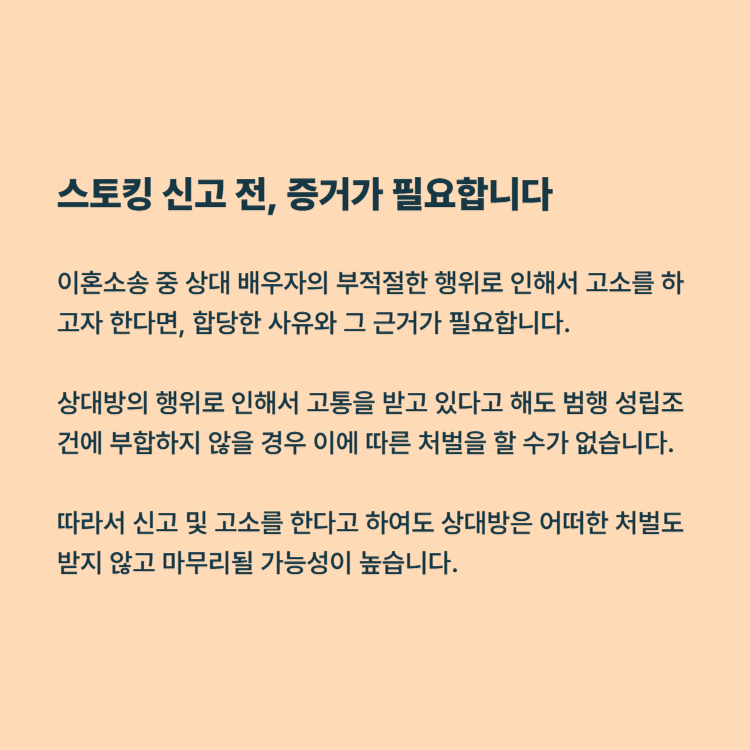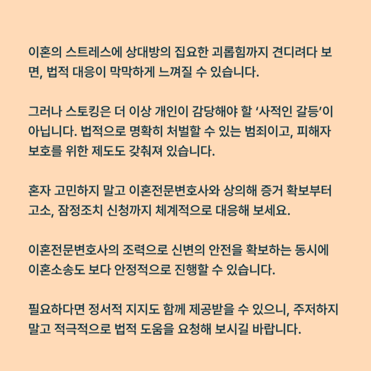 이혼소송이라는 큰 절차를 진행하면서도 상대방의 집요한 괴롭힘까지 견디려다 보면, 법적 대응이 막막하게 느껴질 수 있습니다. 그러나 스토킹은 더 이상 개인이 감당해야 할 ‘사적인 갈등’이 아닙니다. 법적으로 명확히 처벌할 수 있는 범죄이고, 피해자 보호를 위한 제도도 갖춰져 있습니다.