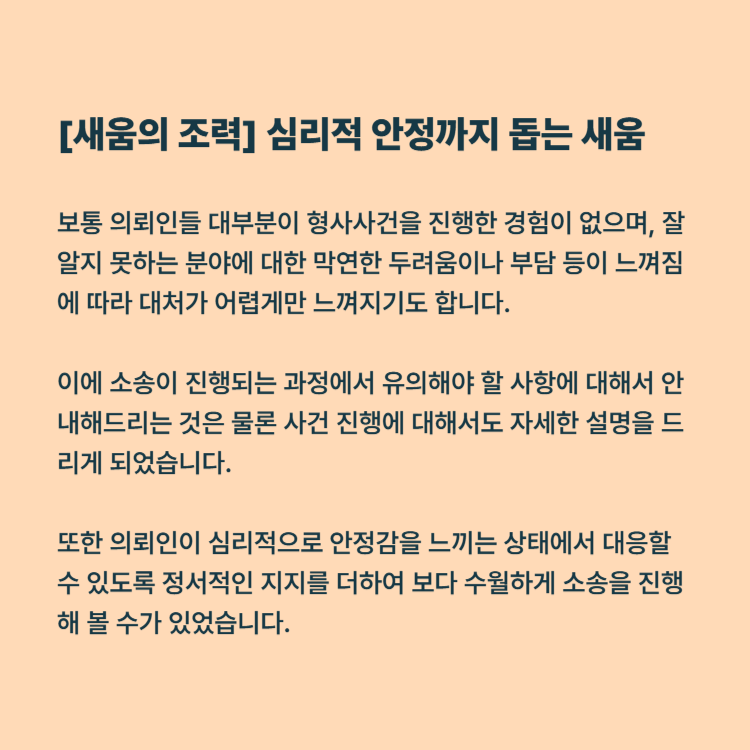 이에 소송이 진행되는 과정에서 유의해야 할 사항에 대해서 안내해드리는 것은 물론 사건 진행에 대해서도 자세한 설명을 드리게 되었습니다. 또한 의뢰인이 심리적으로 안정감을 느끼는 상태에서 대응할 수 있도록 정서적인 지지를 더하여 보다 수월하게 소송을 진행해 볼 수가 있었습니다.