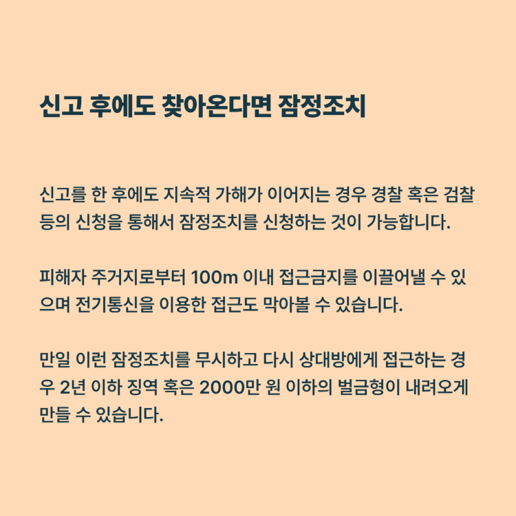 만일 이렇게 지속적으로 찾아오고 괴롭힘을 가한다면 잠정조치를 활용해 보는 것이 좋습니다. 신고를 한 후에도 지속적 가해가 이어지는 경우 경찰 혹은 검찰 등의 신청을 통해서 잠정조치를 신청하는 것이 가능합니다. 피해자 주거지로부터 100m 이내 접근금지를 이끌어낼 수 있으며 전기통신을 이용한 접근도 막아볼 수 있습니다.