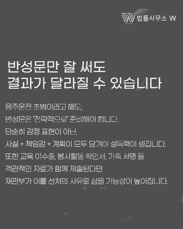 하지만 실무에서는 혈중알코올농도가 높거나 단속 경위가 불리한 경우, 초범이라도 면허취소는 물론 수백만 원의 벌금, 심지어 징역형까지 받을 수 있습니다. 이때 선처 여부에 큰 영향을 미치는 것이 바로 ‘반성문’입니다.