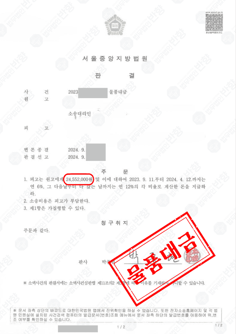 법원은 변호인의 논리를 받아들여 B사의 하자 주장을 배척하고, 물품대금 전액 승소 판결을 내렸습니다. 이에 따라 A씨는 미지급된 대금을 모두 회수할 수 있었고, 지연된 기간에 대한 이자까지 인정받게 되었습니다. 그 결과 A씨는 장기간 이어진 거래처와의 분쟁을 종결짓고 안정적인 사업 운영을 이어갈 수 있었습니다.