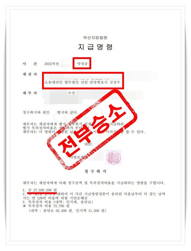 이번 사건은 상대방이 명백한 합의에도 불구하고 위로금 지급을 지연한 사례였습니다. 일반 소송 절차로 갔다면 장기간 소요될 수 있었으나, 지급명령 절차를 활용해 신속히 판결 효력을 확보했고, 곧바로 채권 추심까지 이어가 의뢰인의 실질적인 권리 회복이 가능했습니다.