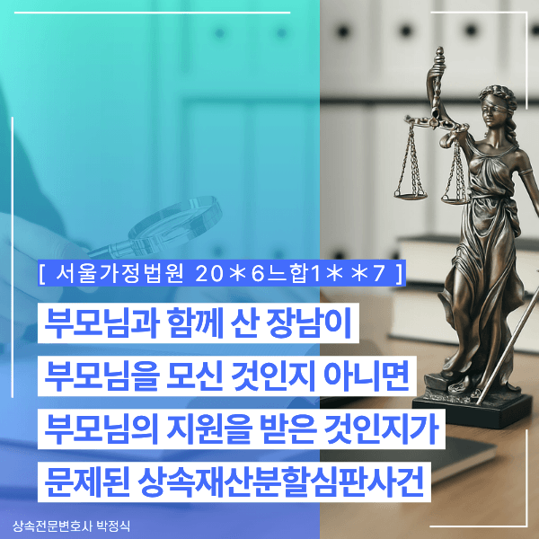 모친께서 돌아가시고 나서, 모친과 함께 평생 동거해온 장남이 모친의 아파트는 자신이 물려받는 것이 당연하다고 하면서 모친의 아파트에 대한 분할을 거부하여, 다른 자녀들이 장남을 상대로 상속재산분할심판청구를 하게 되었습니다. 장남은 모친과 함께 살면서 상당한 재정적 지원을 받았고, 장남이 모친을 모셨다기 보다는 모친이 평생동안 장남을 돌본 것이라는 것이 청구인들의 주장이었고, 이에 반해서 장남은 모친을 평생 모셨다면서 기여분을 주장한 사건이었습니다.