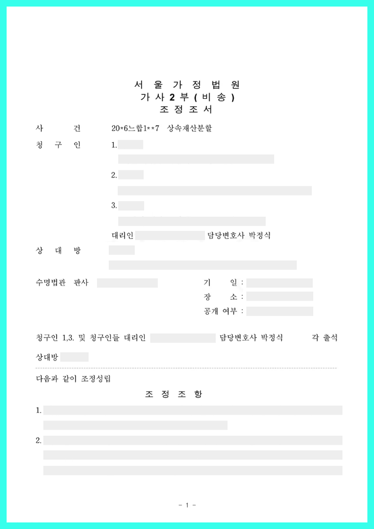 위 사건에 대하여 재판부는, 조정기일을 여러차례 진행하였고, 장남이 자신의 기여분을 주장하지 않는 대신, 장남이 다른 곳에 이사할 동안 충분한 시간을 허용해 주는 내용으로 조정이 성립되었습니다.